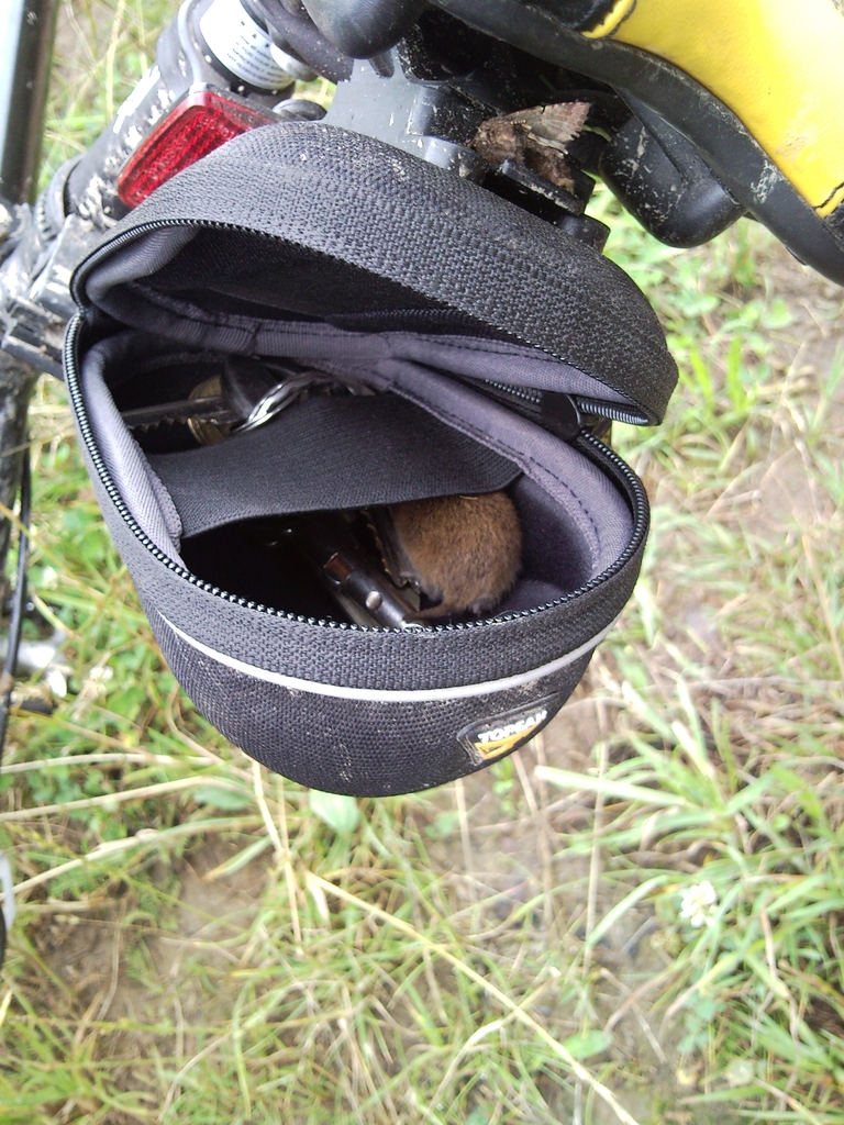 Do Pucka dotarliśmy brzegiem morza, mijając niebezpieczne skarpy i urwiska oraz pola pszenicy, doświadczając pięknych widoków i smaku dzikich słodkich malin (po drodze nagraliśmy parę wygibasów z serii "Z rowerem pod pachą" - już wkrótce na blogu). Czarny szlak Grot Mechowskich zaczął się kawałek za Puckiem. Sama trasa, płaska, wiodła wśród pól, ścieżkami zarośniętymi wysoką trawą, gdzieniegdzie przechodzącymi w wąwozy (krajobraz stanowiły wiatraki, pracujące tego dnia dość intensywnie). I tu nasz solenizant odnalazł zwierzę: ryjówkę, którą wsadził do torby podsiodłowej, by się kolegom pochwalić.